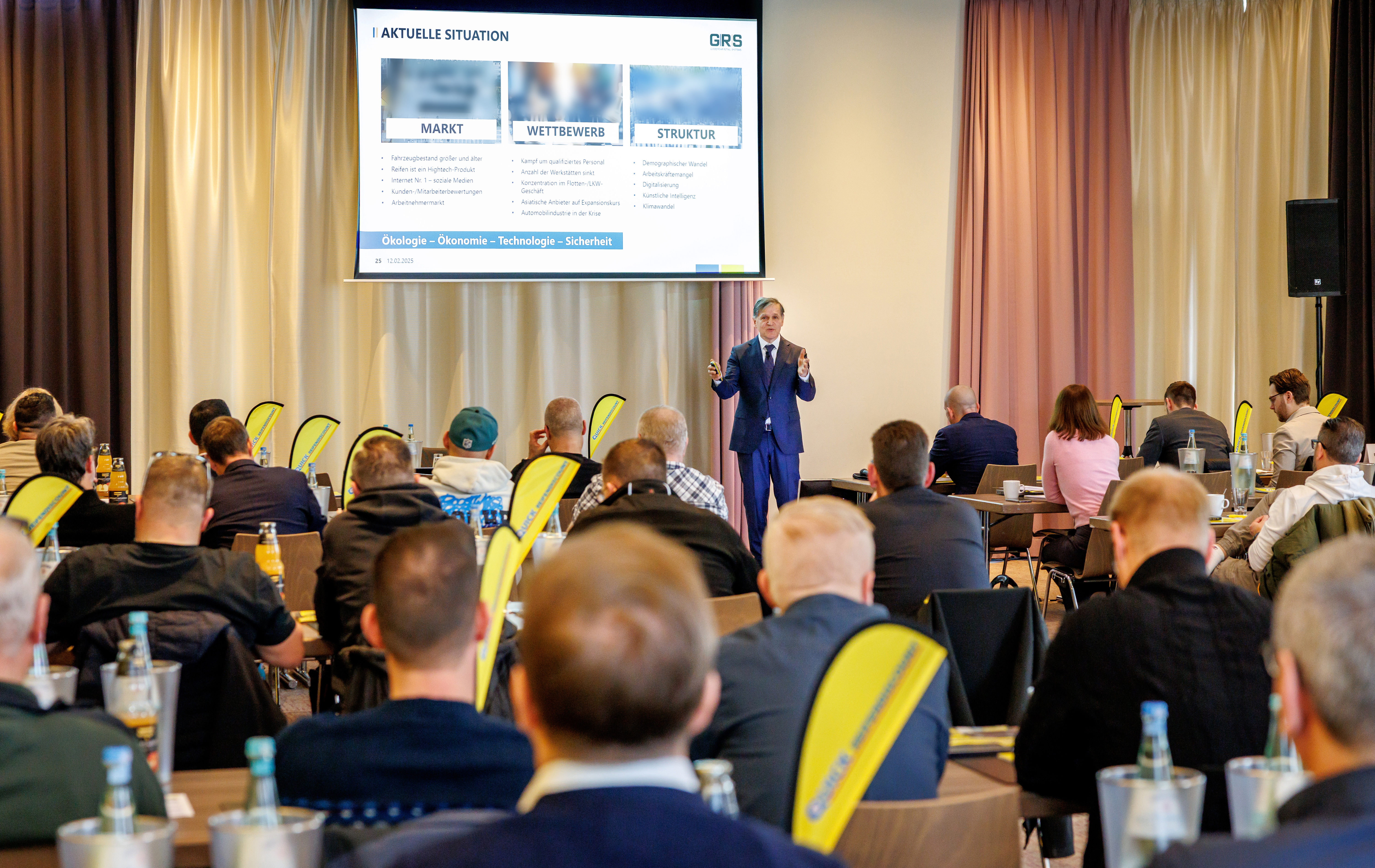 Gemeinsam mit seinem Team und den Experten der Goodyear Retail Systems (GRS) eröffnete Quick-Leiter Benjamin Lipps die Veranstaltung und präsentierte die Erfolge des vergangenen Jahres. Lipps zog eine positive Bilanz für das Geschäftsjahr 2024, das trotz herausfordernder Rahmenbedingungen für die Quick-Gruppe von Wachstum geprägt war. Lieferengpässe, ein verändertes Kundenverhalten und ein gestiegener Beratungsaufwand aufgrund der Alpine-Symbol-Regelung stellten die Partnerbetriebe vor große Aufgaben. Dennoch konnte die Quick-Gruppe das Online-Geschäft weiter ausbauen und den Gesamt-Umsatz um 7,3 % steigern. Durch eine optimierte Vermarktungsstrategie konnte auch eine Verbesserung der Roherträge erreicht werden.