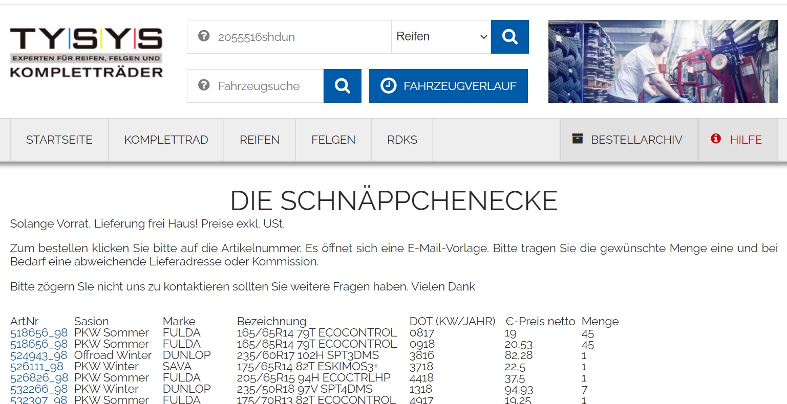 Ein weiteres neues Feature bietet TYSYS mit seiner Schnäppchenecke im Webshop, in der eingeloggte Kunden preiswerte Alternativen finden wie Reifen mit alter DOT, Demoware, aber auch Reifen mit aktueller DOT zum Abverkaufspreis. Die Angebote gelten, solange der Vorrat reicht, die Produkte werden ebenfalls binnen 24 Stunden frei Haus geliefert. „Natürlich spielt auch in der Schnäppchenecke das Thema Nachhaltigkeit eine Rolle“, erklärt Customer Service Consultant Marek Lux. „Reifen mit alter DOT oder Kompletträder sind meist noch in tadellosem Zustand. Anstatt diese zu verschrotten, bieten wir die Ware lieber unseren preisbewussten Kunden an. Mit einem Klick auf die Bestellnummer öffnet sich die E-Mail-Vorlage direkt zum Bestellen der Ware.“